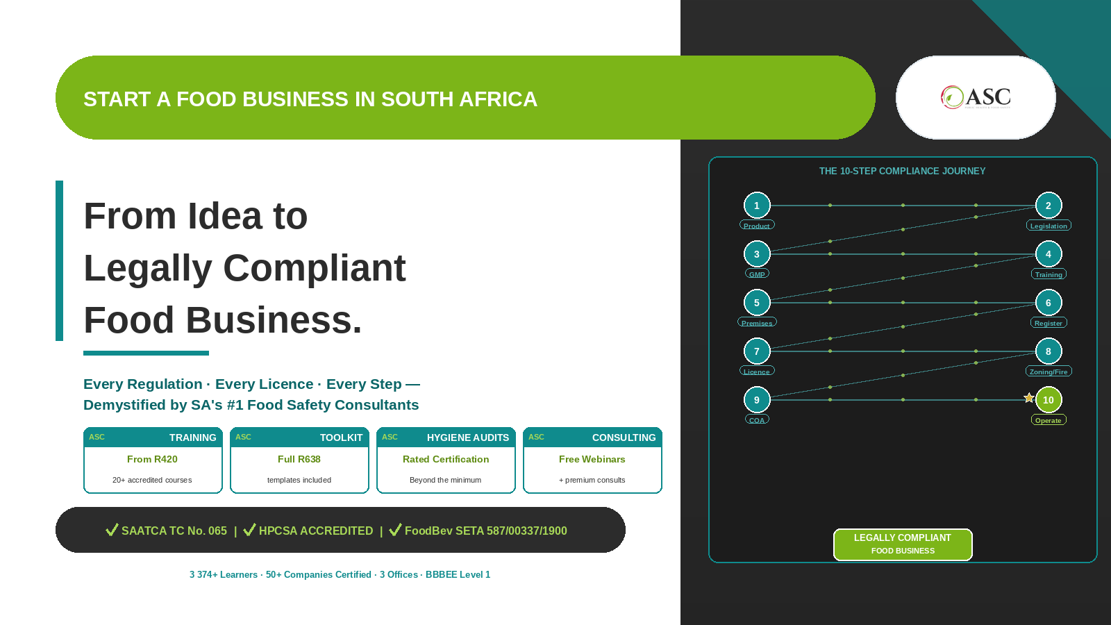 Quick AnswerTo start a legally compliant food business in South Africa you need 10 things: (1) a clearly defined product and process, (2) a CIPC-registered business, (3) compliance with Regulation R638 of 2018 (hygiene), (4) a Certificate of Acceptability (COA) from your municipality, (5) a Business License under the Businesses Act 71 of 1991, (6) a Zoning Certificate if premises aren’t zoned for business, (7) a Fire Compliance Certificate (SANS 10400-T), (8) a Gas CoC if using gas, (9) a Liquor License if selling alcohol, and (10) accredited food safety training for the Person in Charge and every food handler. Training under R638 Regulation 10 is not optional — you cannot get a COA without it. ASC Food Safety Consultants is the only triple-accredited (SAATCA + HPCSA + FoodBev SETA) training and consulting provider in South Africa, offering end-to-end startup support from R649.